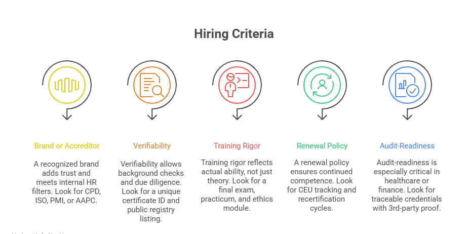 Hiring teams are increasingly prioritizing certifications that are transparent, third-party validated, and audit-proof. Your credential doesn’t just need a logo—it needs a trail of compliance, credibility, and recognition.