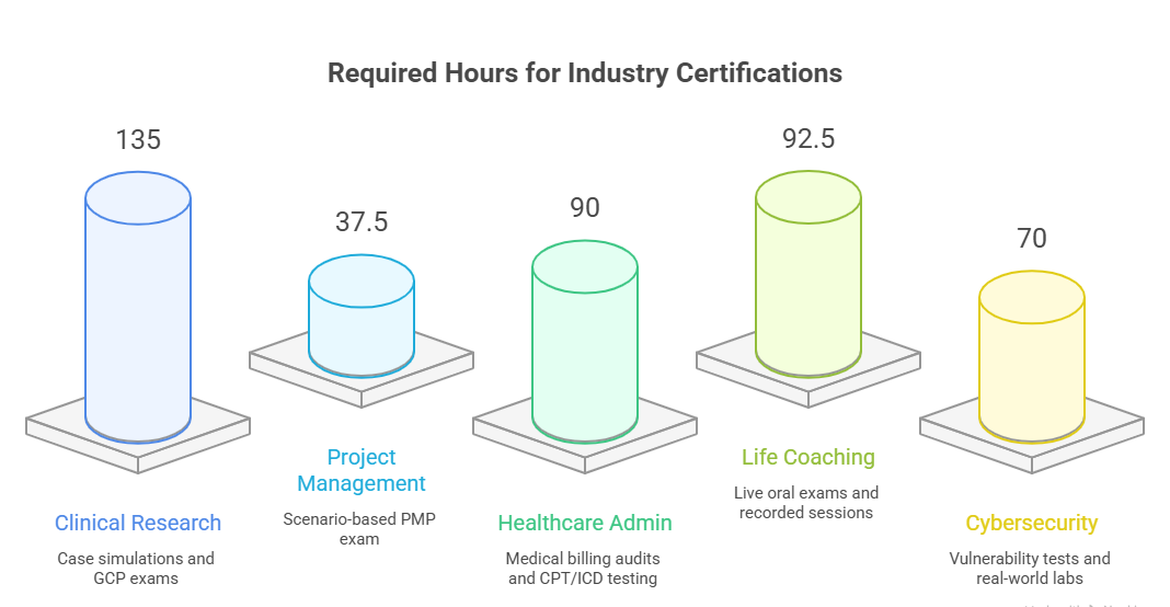 Clinical research certifications (like CRA or CRC) often require 120–150 contact hours, a supervised practicum, and scenario-based or GCP-aligned testing. Ethics training and real patient case simulations are standard.